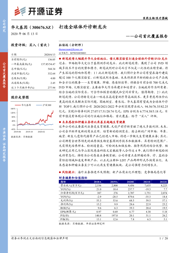 公司未来的增长将由中国大陆、海外和港澳台业务共同驱动。中国大陆的增长主要由肿瘤防控和病原感染推动,生育健康及其他板块稳健增长;海外和港澳台增长短期由新冠检测试剂推动,中长期将借助火眼实验室,结合当地需求,因地制宜开发、导入公司检测产品及其他可能的合作模式。报告预计公司2020/2021/2022年分别实现营业收入94.56/76.35/82.25亿元,同比增长237.7%/-19.3%/7.7%;实现归母净利润27.07/17.51/20.74亿元,同比增长879.6%/-35.3%/18.4%。当前股价对应的P/E和P/B估值(截至2020年6月11日收盘,P/E为18.5/28.6/24.1,P/B为7.2倍)处于历史低位,未充分体现公司作为潜在全球IVD龙头的行业地位和长期成长潜力。首次覆盖,给予“买入”评级。风险提示包括海外业务推进不及预期、新产品商业化不理想以及竞争格局恶化。