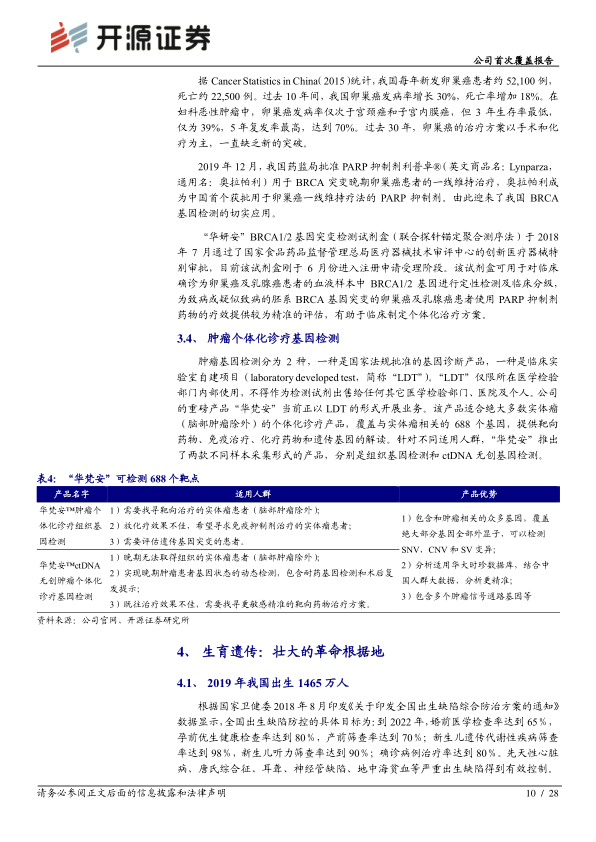 中国癌症防控形势严峻,2015年全国新发恶性肿瘤病例约392.9万例,每年医疗花费超过2200亿元,肿瘤基因检测市场空间广阔。华大基因的肿瘤检测产品储备丰富,覆盖“预防—早筛—诊疗—监测”全肿瘤防控流程。公司正加速推出新产品,如基于甲基化快速靶向测序的肝癌早检技术、同源重组缺陷(HRD)检测技术和实体瘤患者定制化监测技术。其中,肺癌伴随诊断试剂盒“华翡冉”(EGFR/KRAS/ALK基因突变联合检测试剂盒)已于2019年8月获批上市,为肺癌靶向治疗提供基因变异结果。BRCA1/2检测试剂盒“华妍安”已于2018年通过创新医疗器械特别审批,并于2020年6月进入注册申请受理阶段,对卵巢癌及乳腺癌患者使用PARP抑制剂的疗效评估具有重要意义。此外,公司重磅产品“华梵安”以临床实验室自建项目(LDT)形式开展业务,覆盖688个实体瘤相关基因,为患者提供靶向药物、免疫治疗、化疗药物和遗传基因的解读,并提供组织基因检测和ctDNA无创基因检测两种形式。