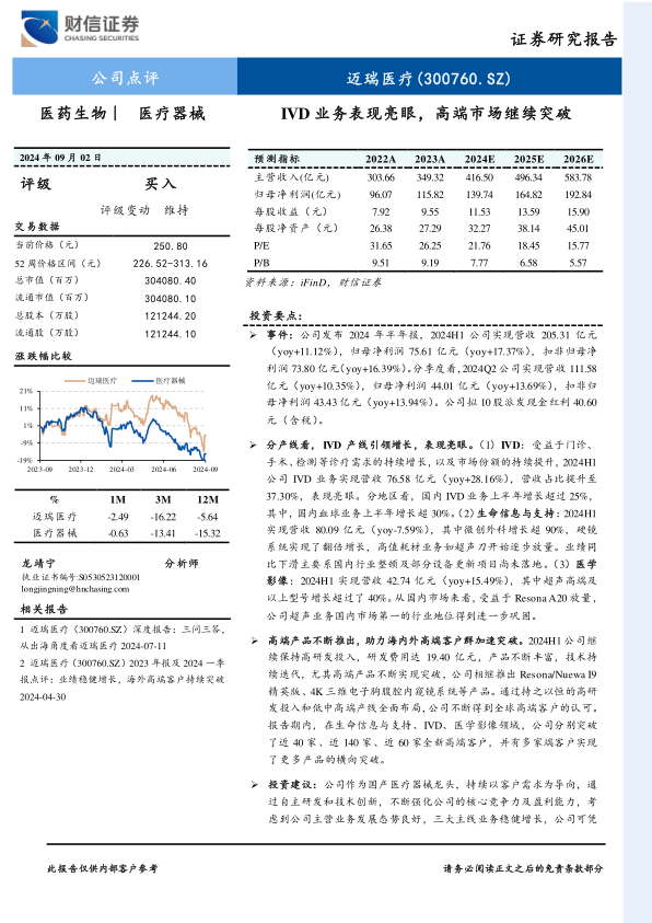 迈瑞医疗发布了2024年半年报,报告期内公司业绩实现稳健增长。