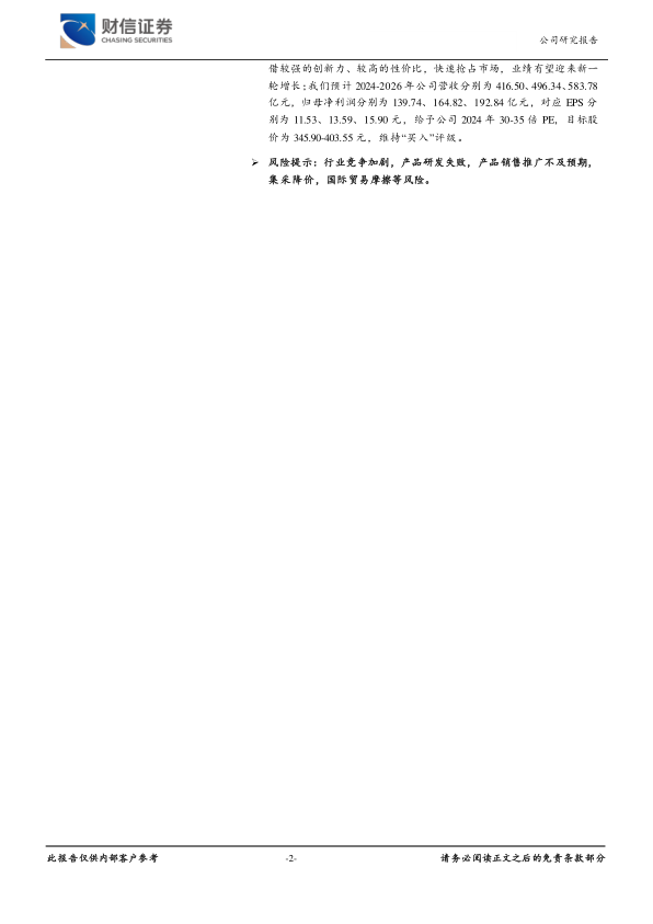 投资建议:公司作为国产医疗器械龙头,持续以客户需求为导向,通过自主研发和技术创新,不断强化公司的核心竞争力及盈利能力,考虑到公司主营业务发展态势良好,三大主线业务稳健增长,公司可凭借较强的创新力、较高的性价比,快速抢占市场,业绩有望迎来新一轮增长;我们预计2024-2026年公司营收分别为416.50、496.34、583.78亿元,归母净利润分别为139.74、164.82、192.84亿元,对应EPS分别为11.53、13.59、15.90元,给予公司2024年30-35倍PE,目标股价为345.90-403.55元,维持“买入”评级。