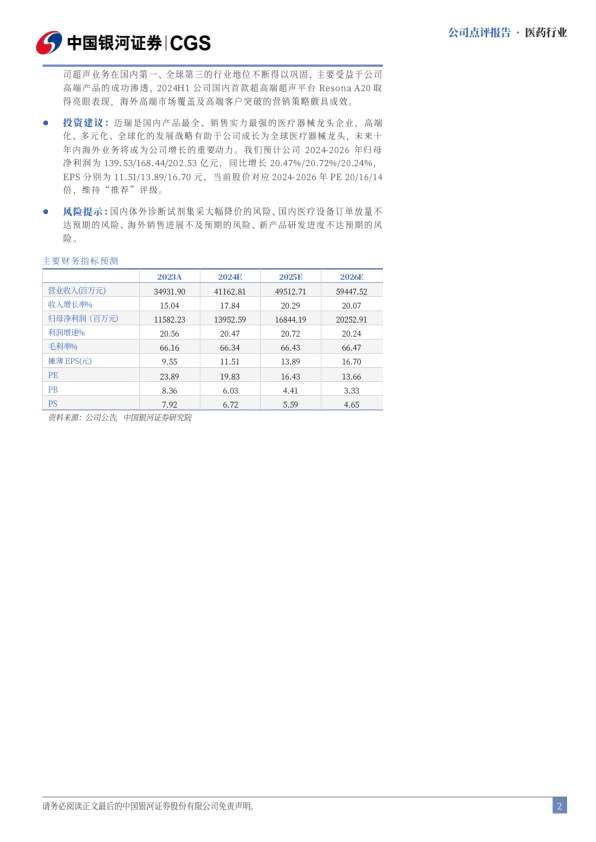 投资建议:迈瑞是国内产品最全、销售实力最强的医疗器械龙头企业,高端化、多元化、全球化的发展战略有助于公司成长为全球医疗器械龙头,未来十年内海外业务将成为公司增长的重要动力。我们预计公司2024-2026年归母净利润为139.53/168.44/202.53亿元,同比增长20.47%/20.72%/20.24%,EPS分别为11.51/13.89/16.70元,当前股价对应2024-2026年PE 20/16/14倍,维持“推荐”评级。