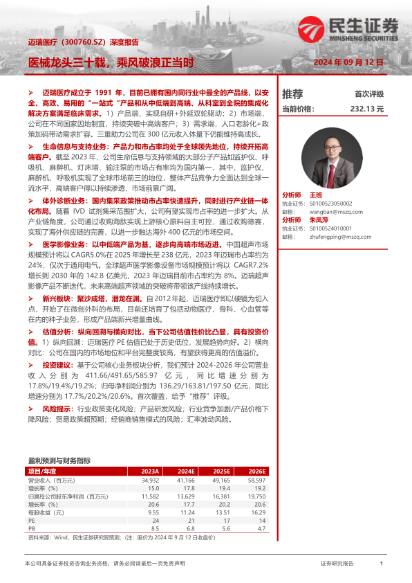 基于对公司核心业务板块的分析,预计迈瑞医疗2024-2026年营业收入分别为411.66亿元、491.65亿元、585.97亿元,同比增速分别为17.8%、19.4%、19.2%;归母净利润分别为136.29亿元、163.81亿元、197.50亿元,同比增速分别为17.7%、20.2%、20.6%。公司综合毛利率预计将稳步上升,从2024年的66.37%提升至2026年的67.35%。
