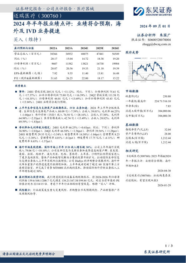 迈瑞医疗2024年半年报业绩符合预期,其中IVD业务和海外市场表现突出,成为公司业绩增长的主要驱动力。公司整体盈利能力保持稳定,费用控制良好。考虑到下半年行业招投标有望恢复,维持“买入”评级。投资者应关注行业政策变化、并购整合进度以及产品销售推广情况等风险因素。
