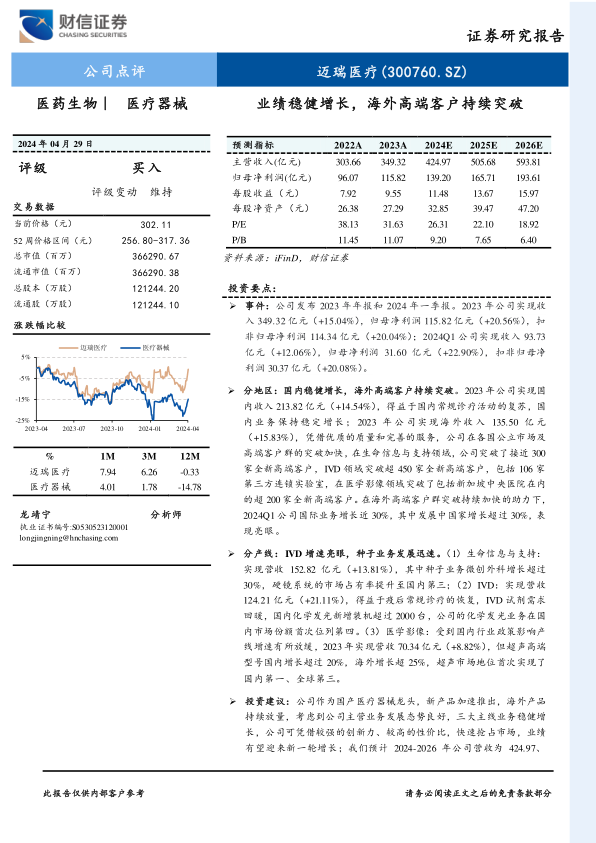 迈瑞医疗2023年业绩稳健增长,同时在海外高端客户市场持续取得突破,尤其是在发展中国家市场表现亮眼。公司凭借创新能力和性价比优势,有望迎来新一轮增长。