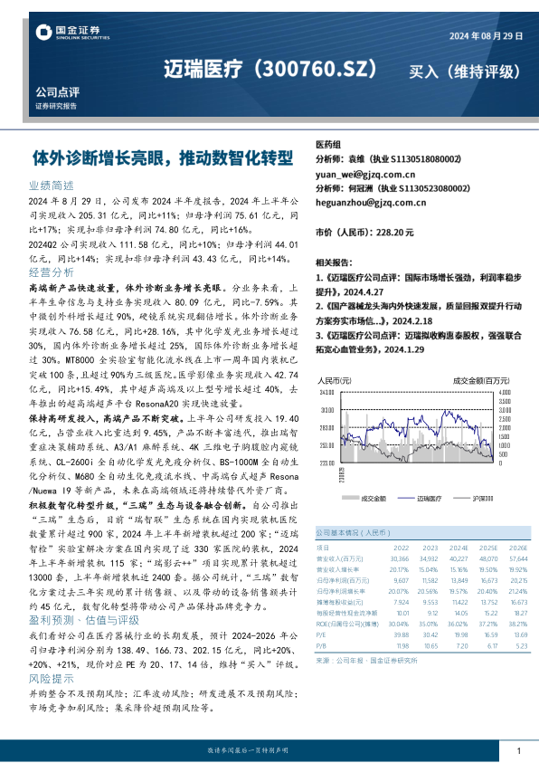 迈瑞医疗2024年上半年业绩表现稳健,高端新产品快速放量,体外诊断业务增长亮眼。公司保持高研发投入,不断推出新产品,并在数智化转型方面取得显著进展。“三瑞”生态系统的推进,有效带动了设备销售,增强了公司产品的品牌竞争力。基于对公司未来发展的良好预期,维持“买入”评级。投资者应关注并购整合、汇率波动、研发进展、市场竞争和集采降价等风险。