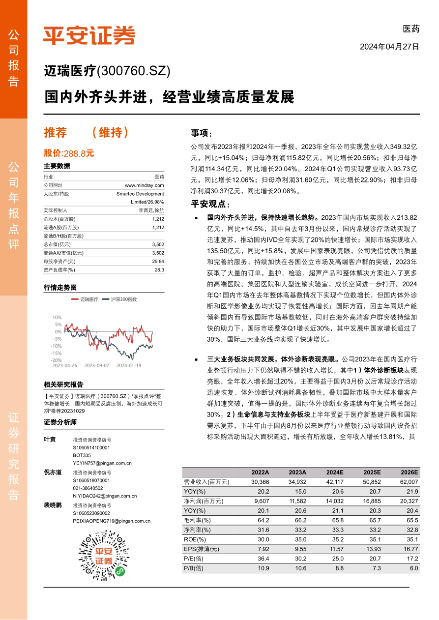维持“推荐”评级。公司作为医疗器械领域平台型龙头企业,国内外需求空间广阔,长期发展可期。根据国内政策环境变化,调整2024-2026EPS预测为11.57、13.93、16.77元(原2024-2025预测为11.61、14.03元),维持“推荐”评级。