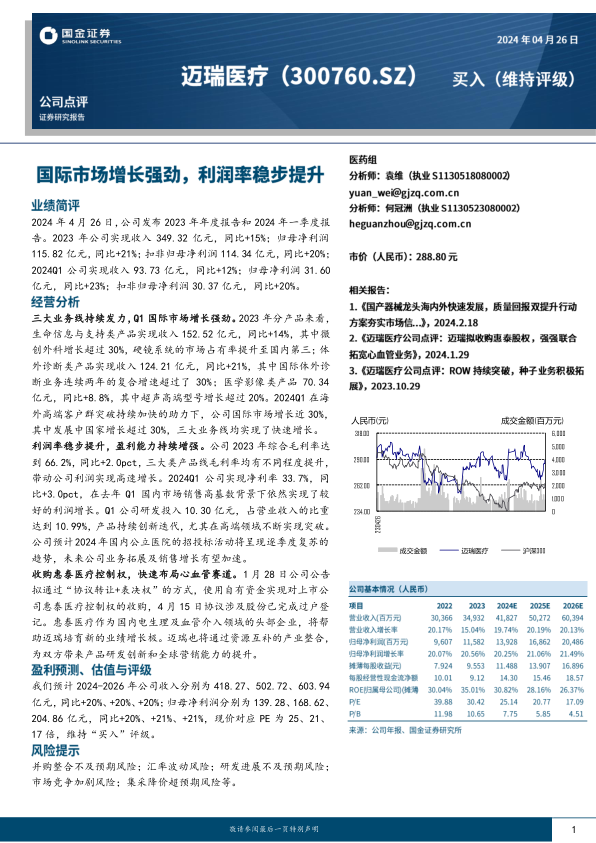 迈瑞医疗2023年业绩表现亮眼,2024年一季度延续增长势头。三大业务线齐头并进,国际市场增长强劲,盈利能力持续提升。公司通过收购惠泰医疗,积极布局心血管赛道,有望打开新的增长空间。维持对公司未来业绩的乐观预期和“买入”评级,但同时也需关注相关风险。