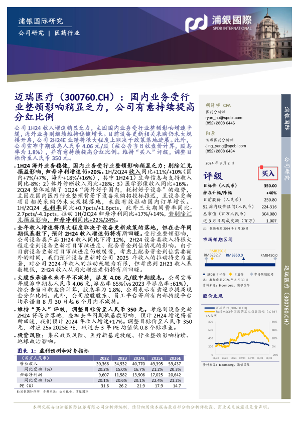 本报告分析了迈瑞医疗1H24的业绩表现,指出国内业务受到行业整顿的影响,但海外业务保持稳健增长。公司积极的分红政策和股东不减持承诺提振了投资者信心。考虑到设备更新项目逐步落地以及去年同期低基数效应,预计下半年增速将有所回暖,维持“买入”评级,调整目标价至人民币350元。同时,报告也提示了集采政策、医疗新基建、行业整顿和地缘政治等风险因素。