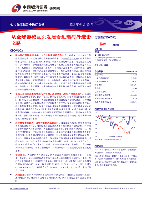 投资建议:迈瑞是国内产品最全、销售实力最强的医疗器械龙头企业,高端化、多元化、全球化的发展战略有助于公司成长为全球医疗器械龙头,未来十年内海外业务将成为公司增长的主要动力。我们预计公司2023-2025年归母净利润分别为117/143/175亿元,同比增长21.49%、22.58%、22.17%,EPS分别为9.63/11.80/14.42元,当前股价对应2023-2025年PE为29/23/19倍,维持“推荐”评级。