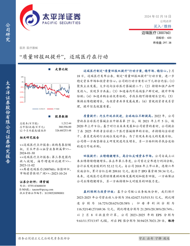 迈瑞医疗制定“质量回报双提升”行动方案,稳市场、稳信心。2月18日,迈瑞医疗发布公告,制定“质量回报双提升”行动方案,进一步稳定资本市场和投资者信心。公司的行动方案有以下几部分内容:(1)聚焦主业发展,大步迈向全球医疗器械前二十;(2)持续加强产品研发投入,实现多方共赢;(3)加速海内外高端客户群突破,提升市场份额;(4)加速并购全球优秀标的,寻找长期可持续增长空间;(5)保持业绩稳健增长,与投资者共享发展成果;(6)重视投资者关系管理,提升信息披露质量。