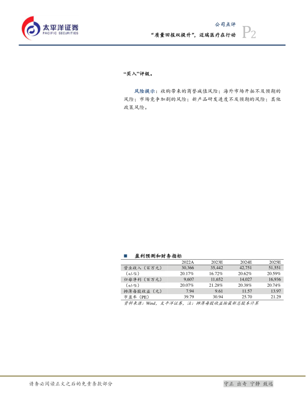 基于对迈瑞医疗未来发展前景的看好,太平洋证券维持“买入”评级。然而,投资者也应关注报告中提到的各项风险,审慎决策。