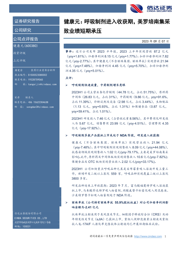 事件: 近日公司发布 2023 半年报, 2023 上半年实现营收 87.2 亿元(yoy+1.81%);归母净利润 8.15 亿元(yoy+1.77%);扣非归母净利润 7.82亿元(yoy-2.77%)。 其中健康元(不含丽珠集团、丽珠单抗)实现营收 21.94亿元(yoy+7.48%),归母净利润 4.45 亿元(yoy+5.70%),扣非归母净利润 4.35 亿元(yoy+5.01%)。
