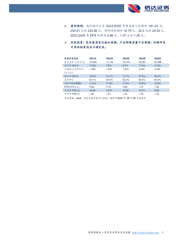 盈利预测: 我们预计公司 2023-2025 年营业收入分别为 181.24 亿、202.61 亿和 224.86 亿,净利润分别为 16.79 亿、 20.4 亿和 24.54 亿,2023-2025 年 EPS 分别为 0.88 元、 1.07 元和 1.28 元。