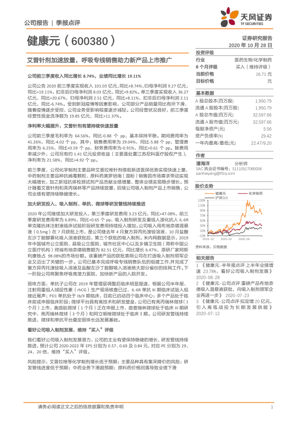 健康元在2020年前三季度实现了稳健的业绩增长,尤其第三季度收入表现强劲,主要得益于艾普拉唑针剂等核心产品的市场放量以及新冠抗体检测试剂的贡献。公司通过优化费用结构和投资收益,显著提升了净利率。同时,健康元持续加大研发投入,在吸入制剂、单抗和微球等创新药领域取得了突破性进展,特别是吸入用布地奈德混悬液的获批上市和呼吸专线销售团队的建设,为公司在呼吸治疗市场的拓展奠定了坚实基础。丽珠制药在单抗和微球研发管线上的积极推进,也为公司未来的长期增长提供了多元动力。尽管面临集采降价、研发进度等潜在风险,但鉴于公司良好的经营状况和丰富的创新产品管线,分析师维持“买入”评级,并对其未来的发展潜力持乐观态度。