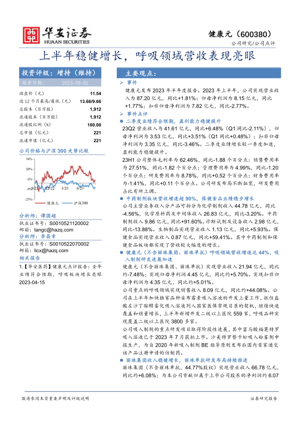健康元发布2023年半年度报告。2023年上半年,公司实现营业收入为87.20亿元,同比+1.81%;归母净利润为8.15亿元,同比+1.77%;扣非归母净利润为7.82亿元,同比-2.77%。