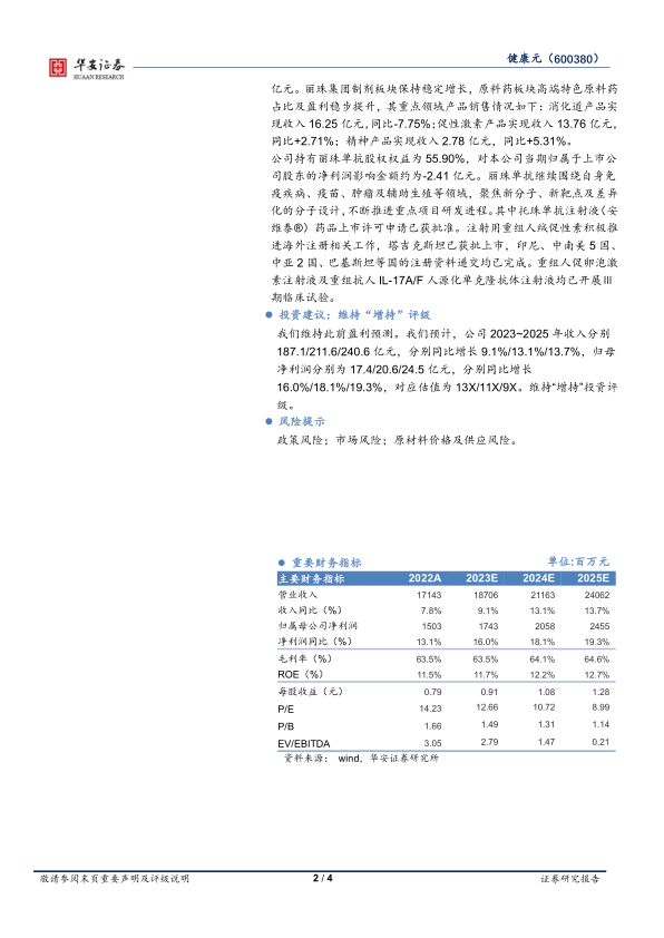 公司持续加大研发投入,研发费用率有所提升,并在吸入制剂、生物制品等创新领域取得显著进展,多款重磅产品获批上市或进入关键临床阶段。丽珠集团作为重要子公司,其制剂和特色原料药业务亦保持稳健增长。华安证券维持“增持”评级,并基于对公司未来收入和净利润的积极预测,认为健康元具备良好的增长潜力和市场价值。