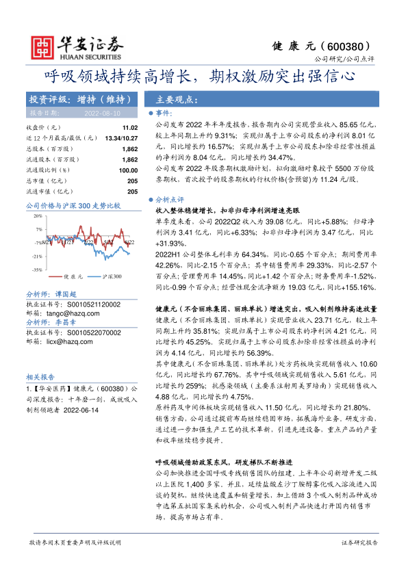 本报告对健康元2022年半年度报告进行了深入分析,指出公司整体业绩稳健增长,尤其是在呼吸领域表现突出。股权激励计划的推出彰显了公司对未来发展的信心。结合公司的高速增长和股权激励目标,认为公司估值偏低,具有投资价值,维持“增持”评级。同时,报告也提示了政策风险超预期、市场价格风险超出预期以及研发进度不及预期等风险因素。