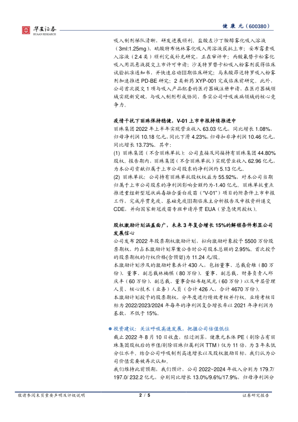 截止 2022 年 8 月 10 日收盘,经过测算,健康元本体 PE(剔除占有丽珠集团股权后的市值/剔除丽珠归属利润 TTM) 仅为 1 1 倍, 为 3 年来低分位水平。结合公司呼吸制剂高速增长以及股权激励目标,我们认为公司价值需要被再次认知。