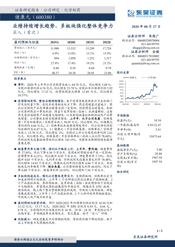 健康元公司在2020年上半年实现了业绩的持续增长,这主要得益于公司在诊断试剂及设备等板块的快速发展。同时,公司也在积极优化费用结构,提高盈利能力。