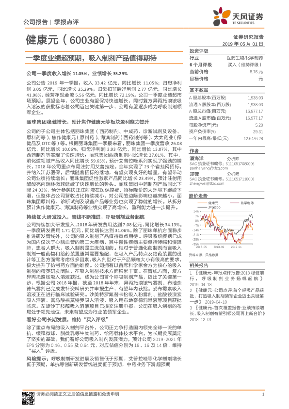 本报告对健康元2019年一季度业绩进行了全面分析,认为公司业绩超出预期,子公司丽珠集团保持稳健增长,研发投入持续加大,尤其是在吸入制剂领域的布局具有领先优势。维持对公司“买入”评级,并看好其长期发展潜力。