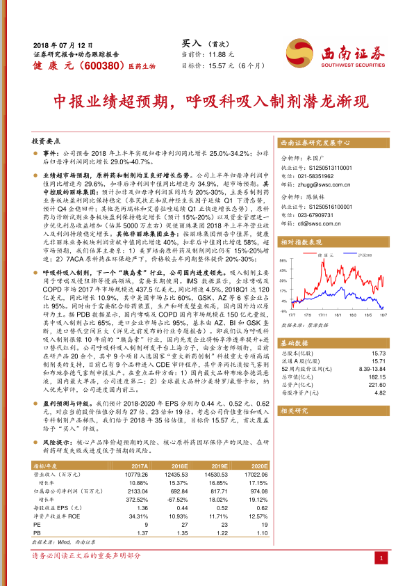 健康元2018年上半年业绩表现强劲,归母净利润和扣非净利润均实现超预期增长,主要得益于丽珠集团的稳定贡献以及非丽珠业务板块(如美罗培南和7ACA原料药)的快速增长。公司在呼吸科吸入制剂领域具有显著的战略优势,其研发平台和产品梯队在国内处于领先地位,该领域被视为具有巨大进口替代和渗透率提升潜力的“下一个胰岛素”行业。通过分部估值法,结合公司核心业务的价值修复和吸入制剂产品线的巨大潜力,分析师给予健康元“买入”评级,目标价15.57元,反映了市场对其未来增长和价值重估的积极预期。同时,报告也提示了核心产品降价、原料药停产以及新药研发失败等潜在风险。
