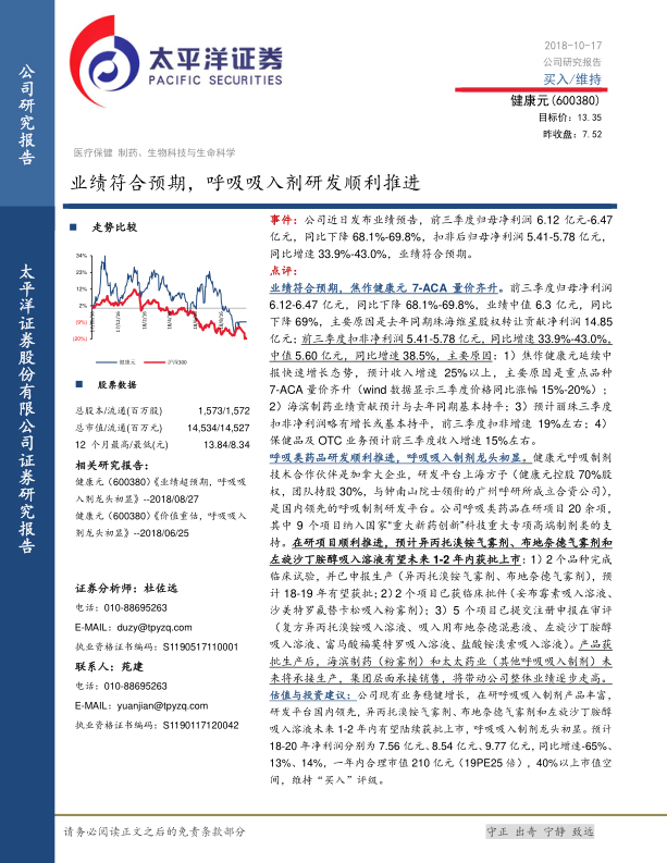 健康元2018年前三季度业绩表现符合市场预期,尽管归母净利润受非经常性损益影响同比下降,但扣除非经常性损益后的归母净利润实现了38.5%的显著增长,主要得益于焦作健康元7-ACA产品量价齐升等核心业务的强劲驱动。公司在呼吸吸入制剂领域的战略布局成效显著,拥有国内领先的研发平台和丰富的在研管线。随着异丙托溴铵气雾剂、布地奈德气雾剂等多个关键产品有望在未来1-2年内获批上市,公司有望逐步确立其在呼吸吸入制剂市场的龙头地位,并带动整体业绩持续增长。基于对公司现有业务的稳健发展和未来呼吸吸入剂业务的巨大潜力,分析师维持“买入”评级,并预计公司未来一年内存在超过40%的市值增长空间。