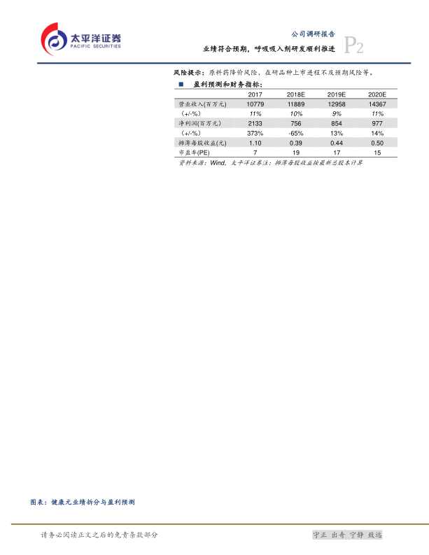 鉴于公司业绩符合预期、主营业务增长强劲、呼吸吸入制剂研发顺利推进且未来市场潜力巨大,太平洋证券维持对健康元的“买入”评级。同时,报告提示了原料药降价风险和在研品种上市进程不及预期的风险。