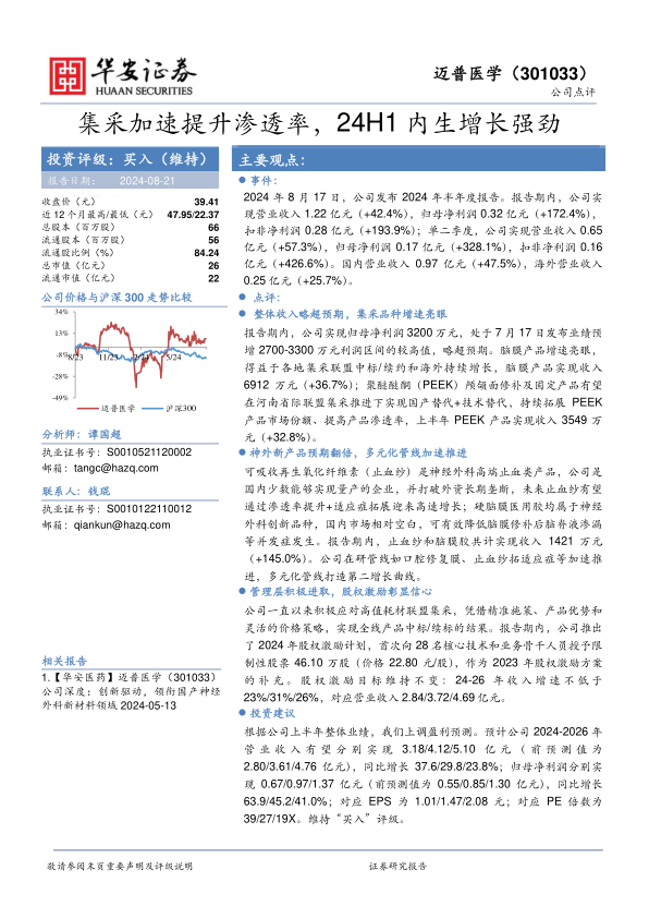 迈普医学于2024年8月17日发布了2024年半年度报告,报告期内公司业绩表现亮眼,显著超出市场预期。