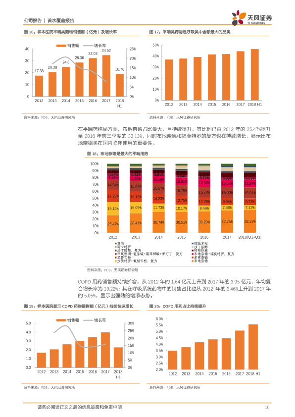 呼吸系统疾病已成为国内第二大疾病,仅次于心脑血管疾病。PDB样本医院数据显示,呼吸系统疾病药物销售额从2012年的47.4亿元增至2017年的78.15亿元,年均复合增长率10.52%,市场空间巨大。我国哮喘患者约3000万人,慢阻肺患者约1亿人,且控制率较低,吸入制剂是主流用药。平喘类药物销售额从2012年的17.38亿元增至2017年的34.52亿元,年均复合增长率14.71%,在呼吸系统药物中占比持续提升,2018年上半年达46.30%。布地奈德是最大的平喘用药,2018年前三季度占比达33.13%。COPD用药销售额从2012年的1.64亿元增至2017年的3.95亿元,年均复合增长率19.22%,显示出强劲增长态势。 吸入制剂具有高技术壁垒,涉及药物与给药装置搭配、颗粒大小控制等复杂工艺。健康元拥有以首席科学家金方为核心的精英研发团队,技术积累丰富,并与钟南山院士团队合资成立公司。公司在吸入制剂领域的布局处于领先地位,拥有4种药物处于CDE评审阶段,2种获临床批件,1种在临床研究,布地奈德和异丙托溴铵气雾剂已申报生产。公司管线中的沙美特罗/氟替卡松、布地奈德/福莫特罗、布地奈德等均为全球重磅产品,2017年全球销售额分别达274.79亿元、206.02亿元和76.84亿元。 布地奈德气雾剂已申报生产,有望明年获批上市。布地奈德是治疗哮喘的基础用药之一,也可作为COPD辅助用药。样本医院数据显示,布地奈德销售额从2012年的5亿元增至2017年的11.96亿元,年均复合增长率19.06%,在呼吸系统用药中占比从10.5%升至2018年上半年的16.5%。市场主要由阿斯利康主导(2017年占比98.92%)。虽然气雾剂销售额相对稳定在900万-1000万元,占比不高(2017年0.78%),但布地奈德吸入混悬液市场巨大,2017年国内销售总额约42.77亿元,公司已获得混悬液临床批件,竞争格局优良。 异丙托溴铵气雾剂有望明年上市,用于预防和治疗COPD及哮喘。样本医院数据显示,异丙托溴铵销售额从2012年的0.63亿元增至2017年的1.32亿元,年均复合增长率15.94%,在呼吸系统用药中占比稳中有升,2018年上半年达1.9%。市场主要由勃林格殷格翰主导(2017年占比99.45%)。国内市场以吸入溶液为主导,气雾剂销售额相对平稳,2017年占比4.04%。公司异丙托溴铵气雾剂已报产,并布局了复方异丙托溴铵吸入溶液,处于行业领先地位。 公司还布局有重磅品种沙美特罗氟替卡松复方制剂,该产品原研GSK,2017年全球销售额达275亿元。国内市场目前完全被GSK垄断,样本医院销售额在2-3亿元水平,2017年占平喘类药物比例为7.68%,市场拓展空间巨大。公司海滨制药的产品正在审评审批中。