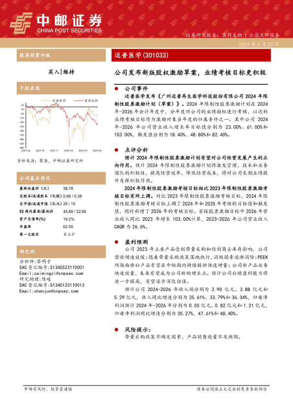 迈普医学通过发布2024年限制性股票激励计划,明确了未来三年积极的业绩增长目标,旨在充分调动核心团队的积极性,提升公司整体运营效率和盈利能力。该计划设定了高于2023年计划的考核目标,并新增了2026年的目标,体现了公司对未来发展的信心和决心。尽管面临带量采购等市场不确定性,但随着消极因素的逐步消除、PEEK颅颌面修补产品及新业务的持续放量,公司预计将实现营收和净利润的稳健增长,逐步消化当前估值,展现出良好的发展前景。