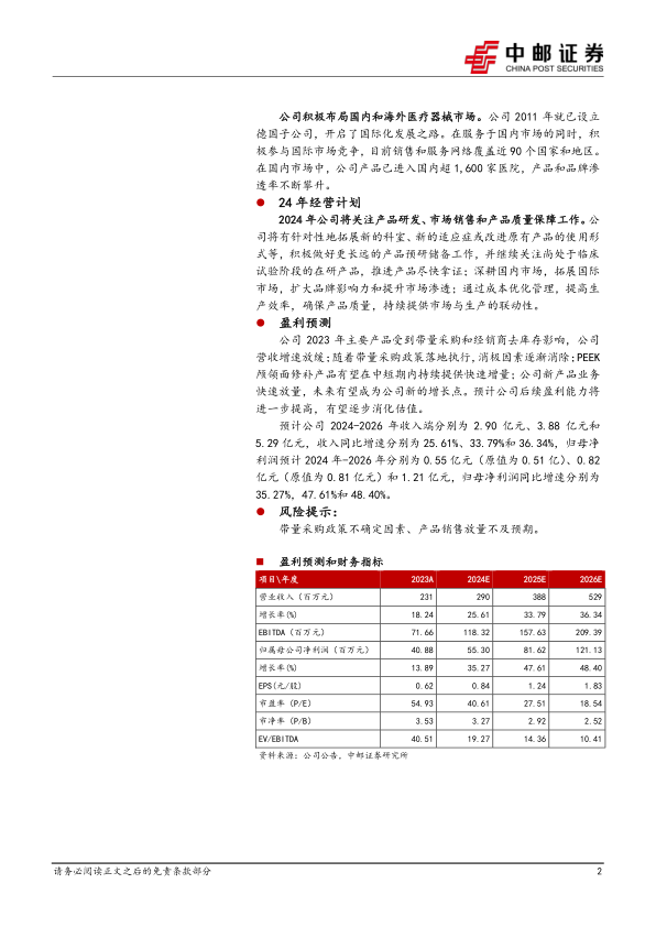 公司2023年主要产品受到带量采购和经销商去库存影响,公司营收增速放缓;随着带量采购政策落地执行,消极因素逐渐消除;PEEK颅颌面修补产品有望在中短期内持续提供快速增量;公司新产品业务快速放量,未来有望成为公司新的增长点。预计公司后续盈利能力将进一步提高,有望逐步消化估值。