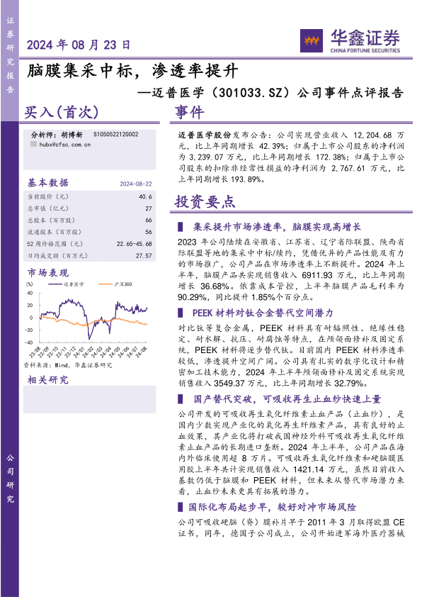 迈普医学在2024年上半年展现出强劲的业绩增长势头,主要得益于脑膜产品通过集采实现市场渗透率和销售额的双重提升,以及有效的成本管控。公司在PEEK材料颅颌面修补和可吸收再生止血纱等创新产品领域也取得了显著进展,尤其止血纱的国产替代打破了进口垄断,具备广阔的市场潜力。此外,公司早期布局的国际化战略为其提供了稳定的境外收入,有效对冲了国内集采带来的市场风险。分析师对公司未来三年的业绩增长持乐观态度,并首次给予“买入”评级,强调其多元化产品线和国际化战略的长期增长潜力。