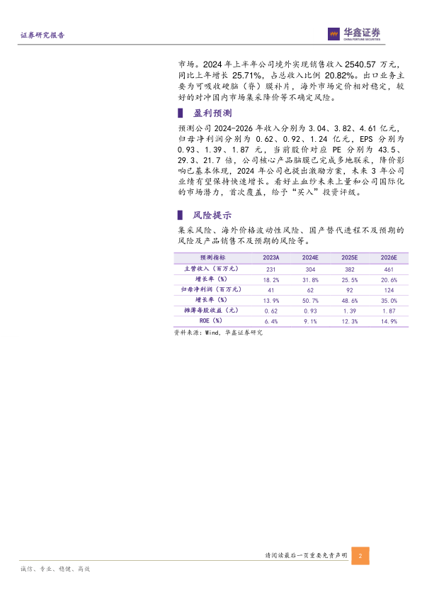 预测公司2024-2026年收入分别为3.04、3.82、4.61亿元,归母净利润分别为0.62、0.92、1.24亿元,EPS分别为0.93、1.39、1.87元,当前股价对应PE分别为43.5、29.3、21.7倍,公司核心产品脑膜已完成多地联采,降价影响已基本体现,2024年公司也提出激励方案,未来3年公司业绩有望保持快速增长。看好止血纱未来上量和公司国际化的市场潜力,首次覆盖,给予“买入”投资评级。