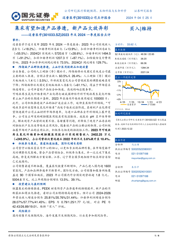 本报告对迈普医学(301033.SZ)2023年及2024年一季度报告进行了深度分析,核心观点如下: