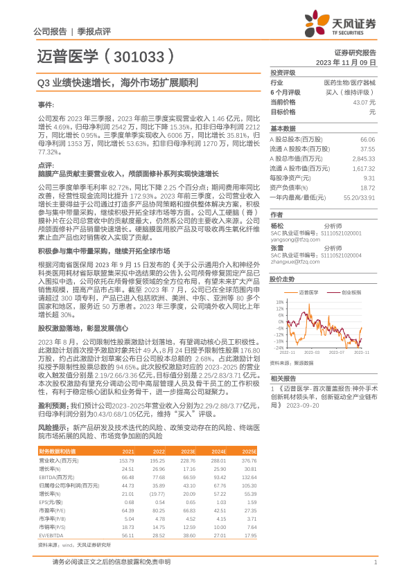 本报告分析了迈普医学(301033)2023年第三季度业绩,指出公司Q3业绩实现快速增长,单季度收入同比增长35.81%,归母净利润同比增长53.63%。