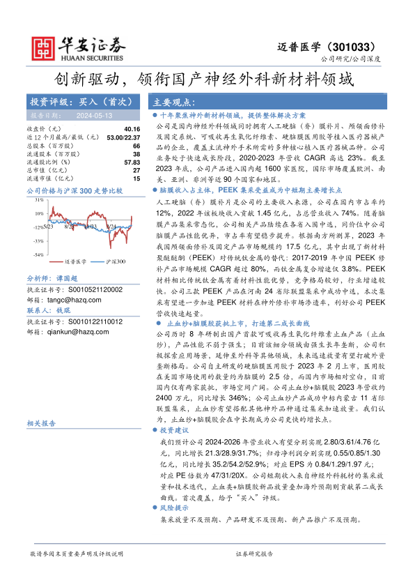 我们预计公司2024-2026年营业收入有望分别实现2.80/3.61/4.76亿元,同比增长21.3/28.9/31.7%;归母净利润分别实现0.55/0.85/1.30亿元,同比增长35.2/54.2/52.9%;对应EPS为0.84/1.29/1.97元;对应PE倍数为47/31/20X。公司短期收入来自神经外科耗材的集采放量和技术迭代,止血类+脑膜胶新品放量叠加海外预期则贡献第二成长曲线。首次覆盖,给予“买入”评级。