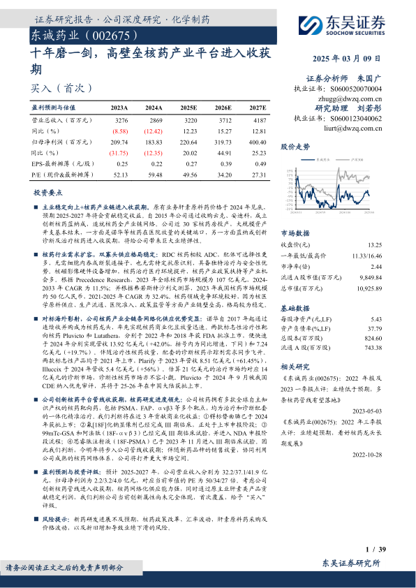 东诚药业凭借其在核药领域的前瞻性布局和持续投入,已成功构建起高壁垒、全链条的核药产业平台。在肝素原料药业务企稳回升的基础上,公司创新核药管线正逐步进入收获期,尤其在PSMA和FAP靶点诊疗一体化核药的研发进度上具备全球领先优势。同时,公司完善的核药房网络、专业的CRDMO服务以及对阿尔茨海默病前沿诊断技术的参股,进一步巩固了其在核药行业的竞争地位。面对全球及中国核药市场的快速增长和政策支持,东诚药业有望凭借其强大的创新能力和网络化供应优势,实现业绩的显著增长和市场空间的持续拓展。首次覆盖给予“买入”评级,反映了市场对其创新属性和未来增长潜力的认可。