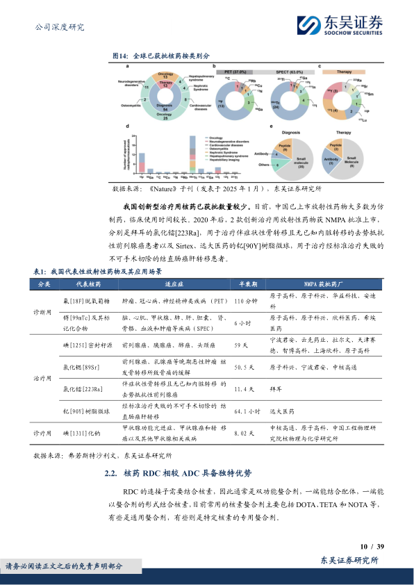 放射性核素偶联药物(RDC)结合了精准靶向和强效杀伤优势,通过连接子及螯合剂将放射性核素与配体结合,实现分子层面早期诊断或针对肿瘤组织进行治疗。核药可分为诊断类和治疗类,主要应用于影像诊断和肿瘤治疗,以及心血管疾病、神经退行性疾病等。全球已获批核药64款,其中50款用于诊断,13款用于治疗,1款诊疗一体化。我国已上市放射性药物42款,多数为仿制药,但创新治疗用核药数量正在增加。