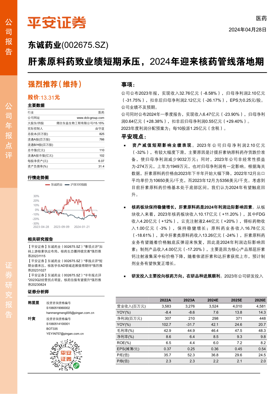本报告对东诚药业(002675.SZ)2023年报和2024年一季度报进行了分析,并维持“强烈推荐”评级。