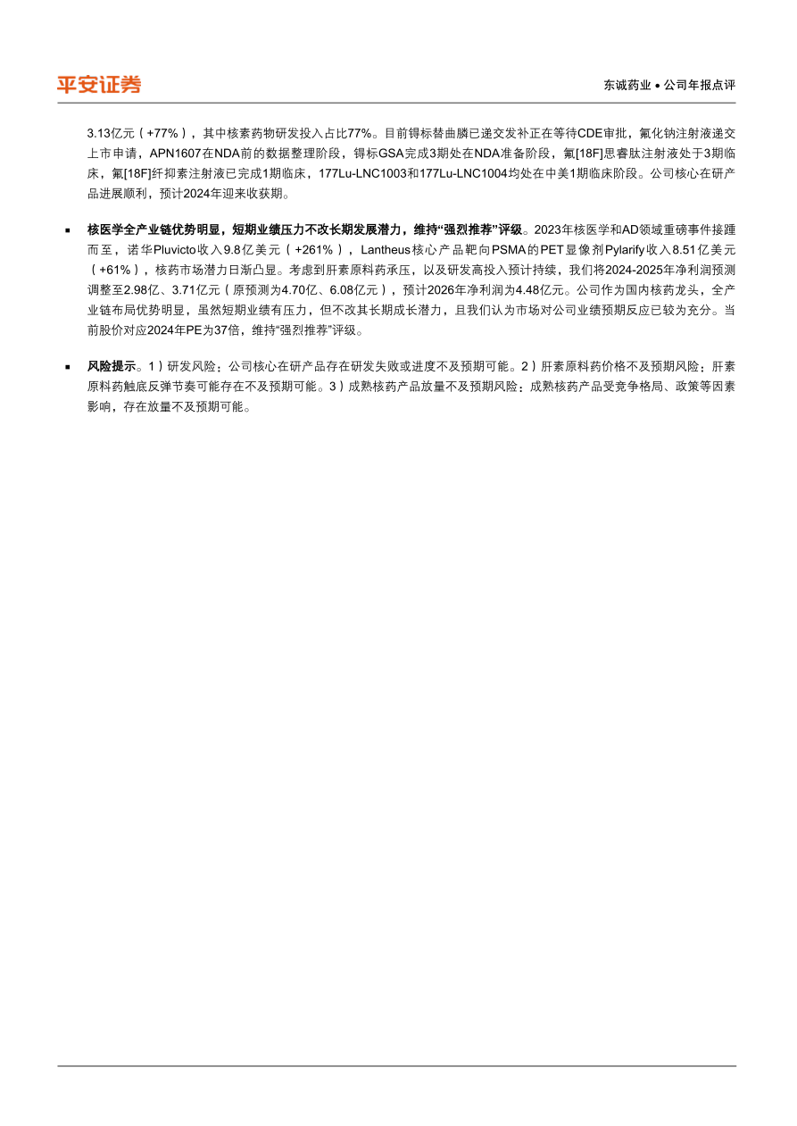 核医学全产业链优势明显,短期业绩压力不改长期发展潜力,维持“强烈推荐”评级。2023年核医学和AD领域重磅事件接踵而至,诺华Pluvicto收入9.8亿美元(+261%),Lantheus核心产品靶向PSMA的PET显像剂Pylarify收入8.51亿美元(+61%),核药市场潜力日渐凸显。考虑到肝素原料药承压,以及研发高投入预计持续,我们将2024-2025年净利润预测调整至2.98亿、3.71亿元(原预测为4.70亿、6.08亿元),预计2026年净利润为4.48亿元。公司作为国内核药龙头,全产业链布局优势明显,虽然短期业绩有压力,但不改其长期成长潜力,且我们认为市场对公司业绩预期反应已较为充分。当前股价对应2024年PE为37倍,维持“强烈推荐”评级。