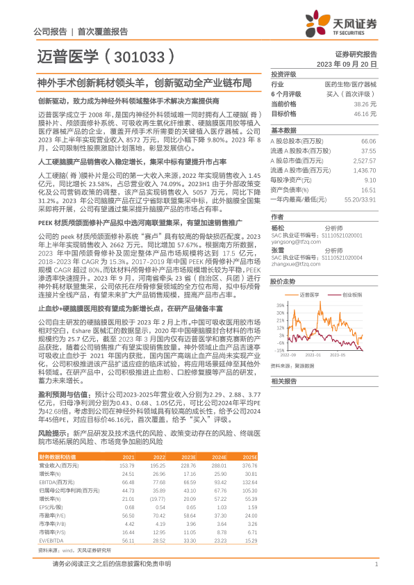 迈普医学作为神经外科手术创新耗材领域的领军企业,凭借其全面的产品线、强大的研发实力和前瞻性的全球化战略,在广阔的神经外科高值耗材市场中占据独特地位。公司在人工硬脑膜、颅颌面修补、医用胶和止血材料等核心产品上均展现出显著的市场潜力和竞争优势,并通过积极参与带量采购加速国产替代进程。尽管面临新产品研发、政策变动和市场竞争等风险,但其创新驱动的平台型企业战略和持续增长的盈利能力,使其具备较高的投资价值。基于对公司未来业绩的积极预测,报告给予“买入”评级,并设定目标价46.16元。