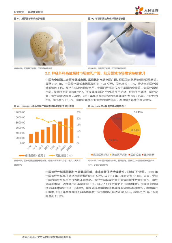 中国是全球第二大医疗器械市场,2020年市场规模约为7341亿元,同比增长18.3%。高值医用耗材作为医疗器械行业的重要组成部分,2018年市场规模约为1046亿元,同比增长20.37%,是增长最快的细分领域。神经外科高值耗材市场需求旺盛,2018年市场规模约为36亿元,预计2023年将达到61亿元,2018-2023年复合年增长率(CAGR)为11.12%。神经外科开颅手术量逐年攀升,2022年中国神经外科开颅手术量约90万台,带动相关耗材需求持续增加。