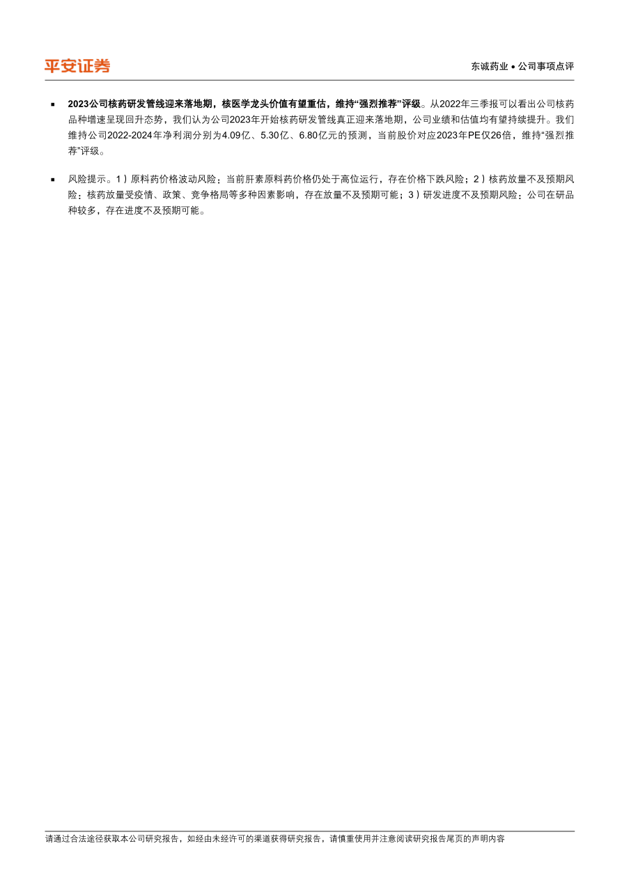 风险提示。1)原料药价格波动风险:当前肝素原料药价格仍处于高位运行,存在价格下跌风险;2)核药放量不及预期风险:核药放量受疫情、政策、竞争格局等多种因素影响,存在放量不及预期可能;3)研发进度不及预期风险:公司在研品种较多,存在进度不及预期可能。