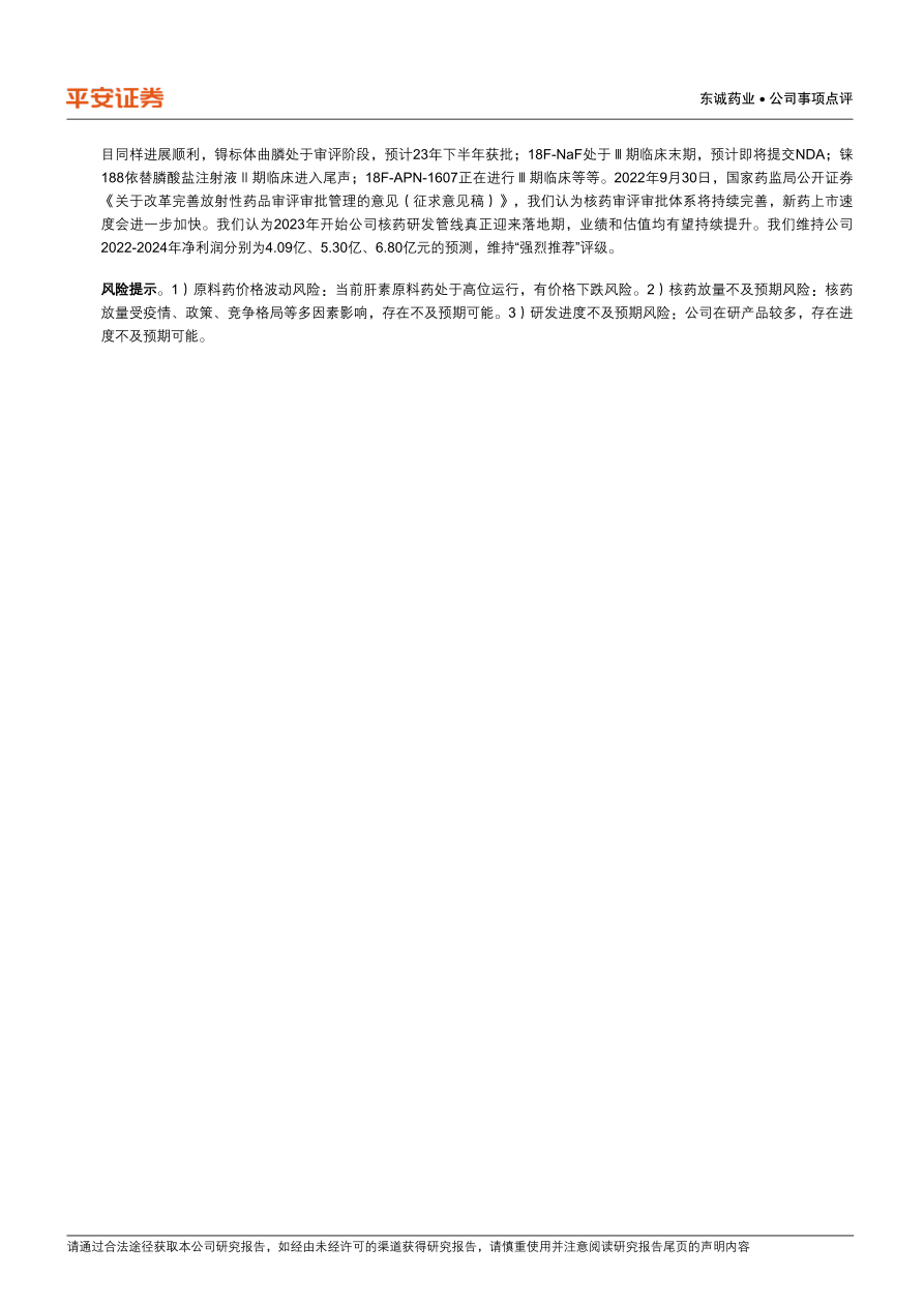 风险提示。1)原料药价格波动风险:当前肝素原料药处于高位运行,有价格下跌风险。2)核药放量不及预期风险:核药放量受疫情、政策、竞争格局等多因素影响,存在不及预期可能。3)研发进度不及预期风险:公司在研产品较多,存在进度不及预期可能。