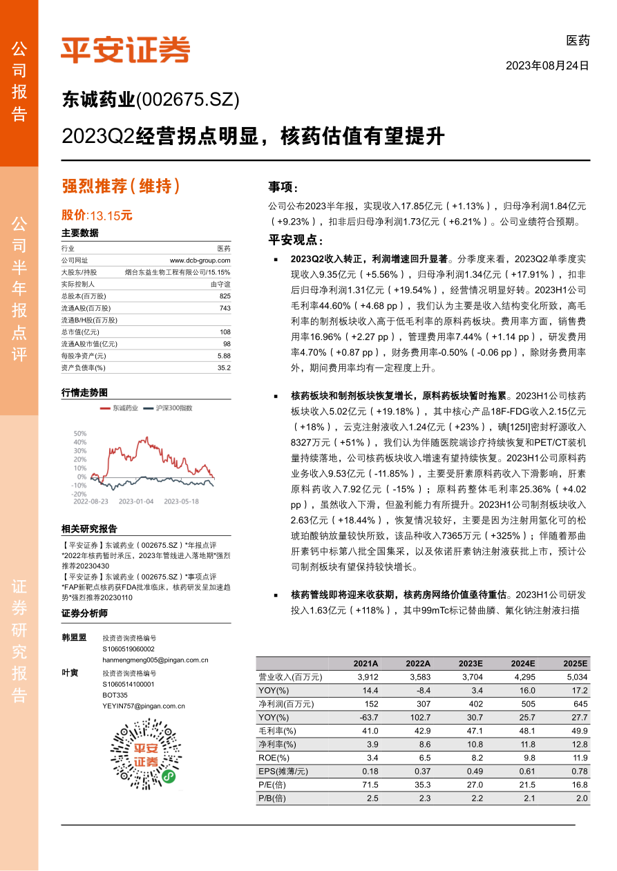 核药发展前景广阔,维持“强烈推荐”评级。诺华创新核药品种Pluvicto放量持续超预期,有望成为核药领域第一个年销售额超过10亿美金的重磅炸弹,从而大幅提升核药行业发展信心。公司具备完整的核药生态圈布局,竞争优势明显。我们暂维持公司2023-2025年归母净利润分别为4.02亿、5.05亿、6.45亿元的预测,当前市值对应2023年PE仅27倍,维持“强烈推荐”评级。