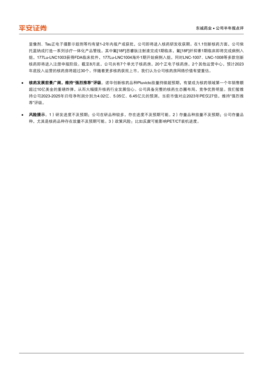 风险提示。1)研发进度不及预期:公司在研品种较多,存在进度不及预期可能。2)存量品种放量不及预期:公司存量品种,尤其是核药品种存在放量不及预期可能。3)政策风险:比如反腐可能影响PET/CT装机进度。