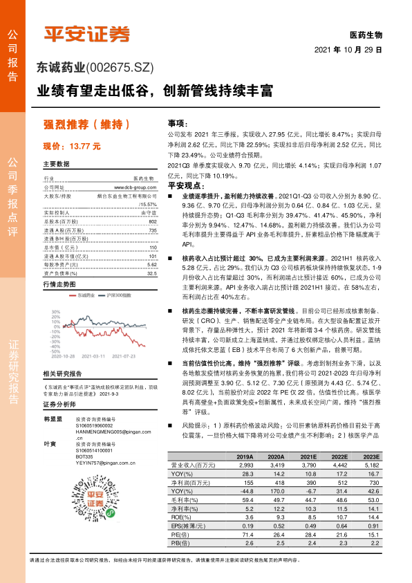东诚药业发布的三季报显示,公司业绩逐季提升,盈利能力持续改善,核药业务成为主要利润来源。公司不断完善核药生态圈,丰富研发管线,未来成长空间广阔。虽然考虑到制剂业务下滑和疫情影响,下调了盈利预测,但当前估值仍然具有性价比,维持“强烈推荐”评级。需要关注原料药价格波动、存量品种放量不及预期以及研发风险。