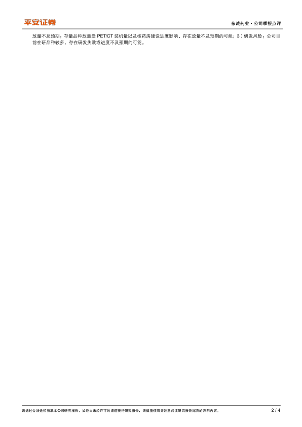 风险提示:1)原料药价格波动风险:公司肝素钠原料药价格目前处于高位震荡,一旦价格大幅下降将对公司业绩产生不利影响;2)核医学产品放量不及预期:存量品种放量受PET/CT装机量以及核药房建设进度影响,存在放量不及预期的可能;3)研发风险:公司目前在研品种较多,存在研发失败或进度不及预期的可能。