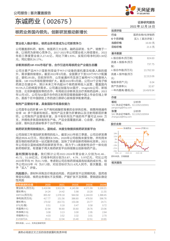 尽管2022年前三季度营业收入略有下滑,但归母净利润实现了26.17%的同比增长,显示出公司稳健的盈利能力。公司在肝素原料药和制剂业务方面也保持了行业领先地位,并积极向下游制剂领域拓展。分析师预计,随着核药业务的高速增长、肝素制剂的获批上市以及传统原料药业务的稳定贡献,公司未来营收和净利润将持续增长。基于其在核药领域的高成长性,报告首次覆盖给予“买入”评级,目标价格为21.6元人民币,凸显了市场对其未来发展潜力的认可。