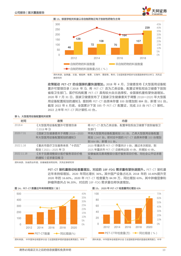 政策层面,2018年PET-CT被调整为乙类设备,审批权下放至省级卫生部门,加速了全国装机量的增长。2020年,国家卫健委将PET-CT配置规划从333台增加到884台,新增551台。截至2022年6月底,全国累计下发335个PET-CT配置证,完成215台装机,其中2022年上半年新增40台。PET-CT装机量的快速增长直接推动了检查量的增加,2020年PET-CT检查量达到84.99万例,同比增长63%,其中肿瘤显像和筛查占比96.20%,预示着18F-FDG需求将快速提升。